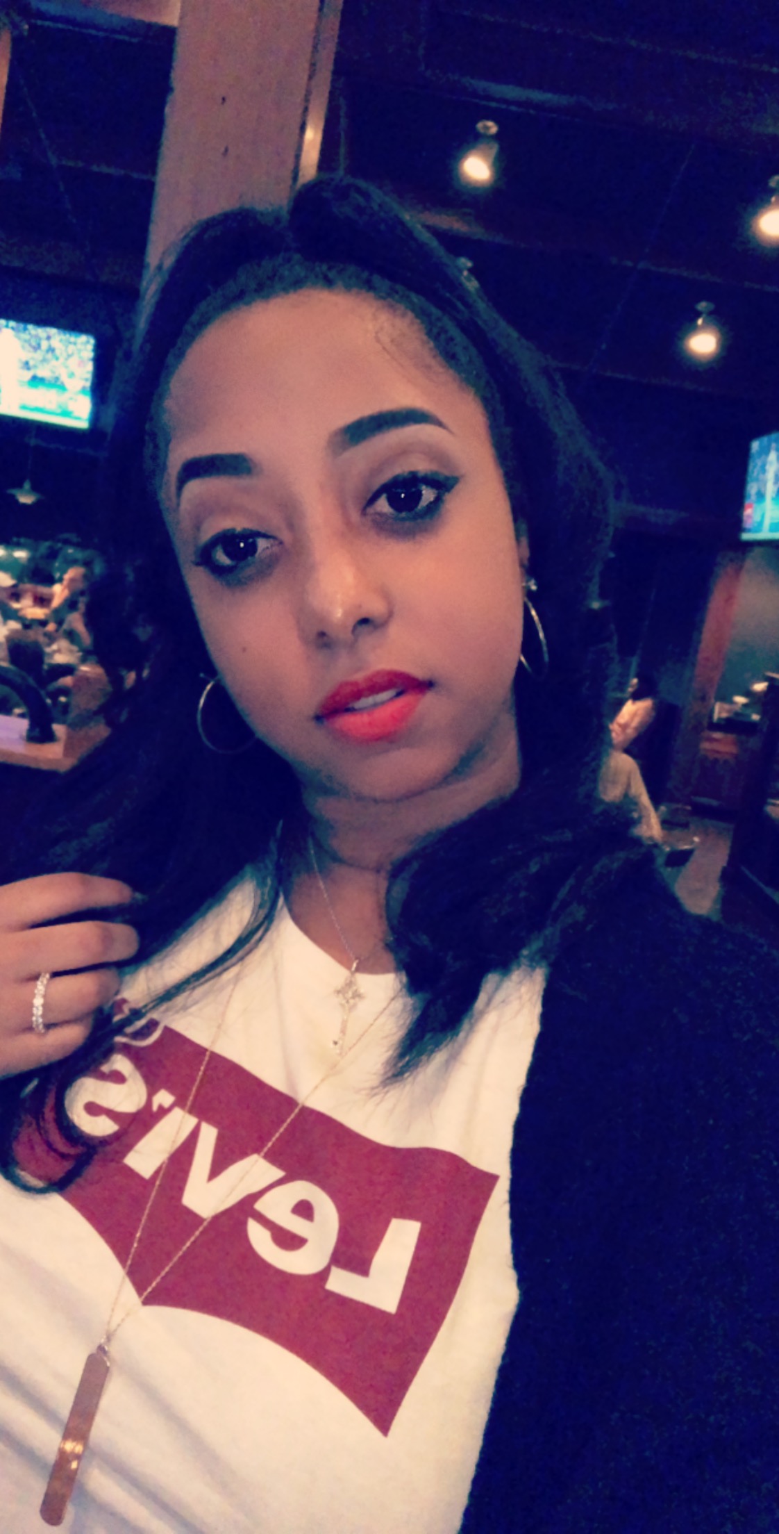I decide to dress down because we weren’t doing much but getting drinks and going to 13th Gate. And also because my toes were numb from my boots the night before 😖. I’m a Levi junkie so I wore my black skinny mid-rise Levi jeans with a white Levi logo shirt. Added my Burberry crossbody and a red DAP lip (Dabble). Last but not least my faves; all black Huarache shoes. Simple but cute!